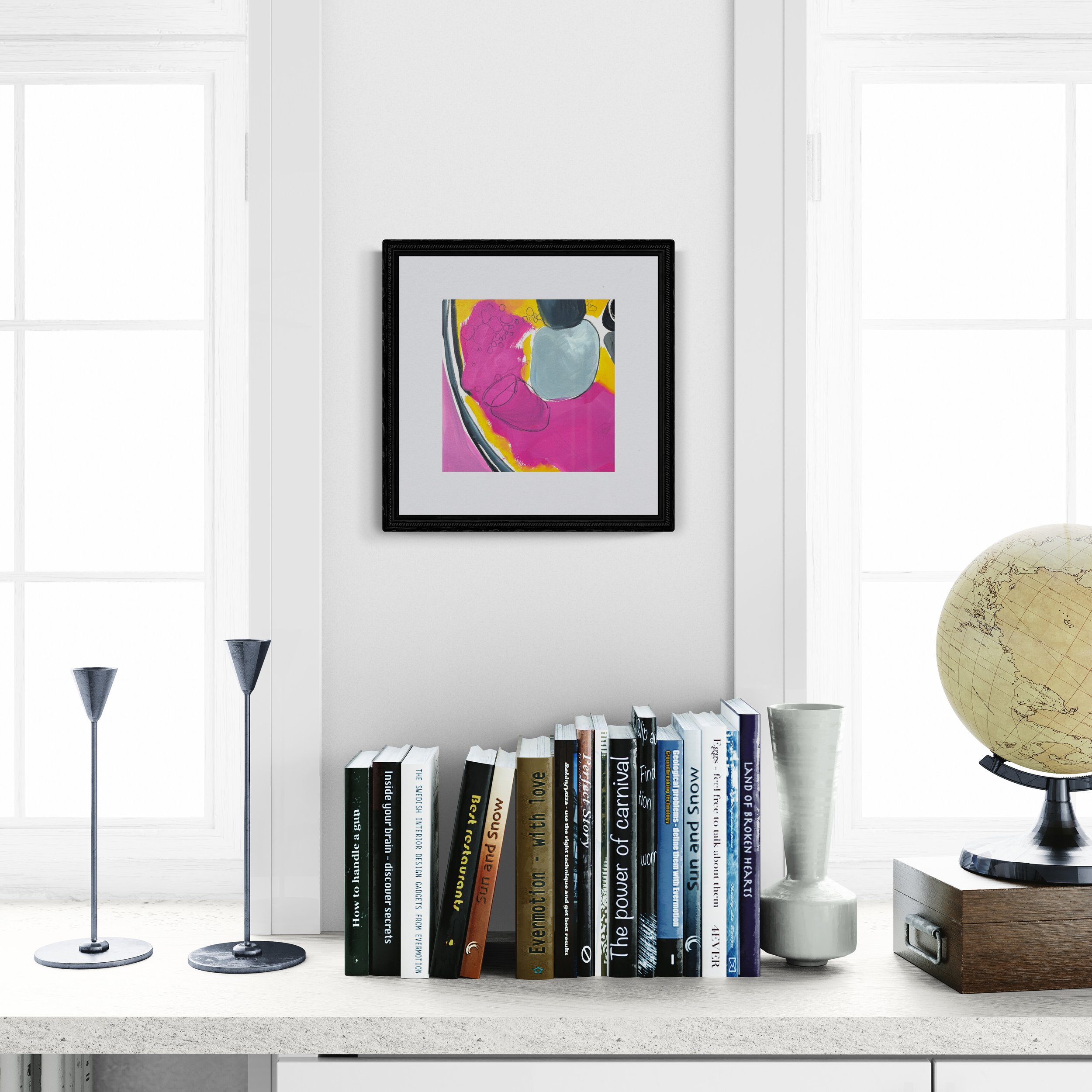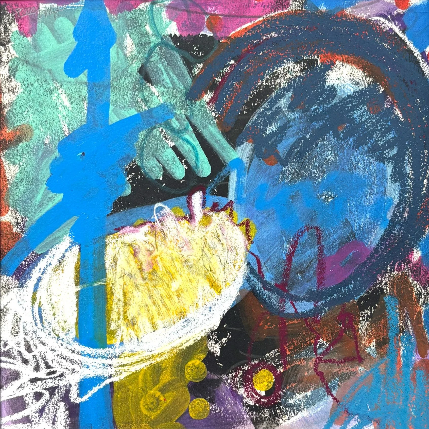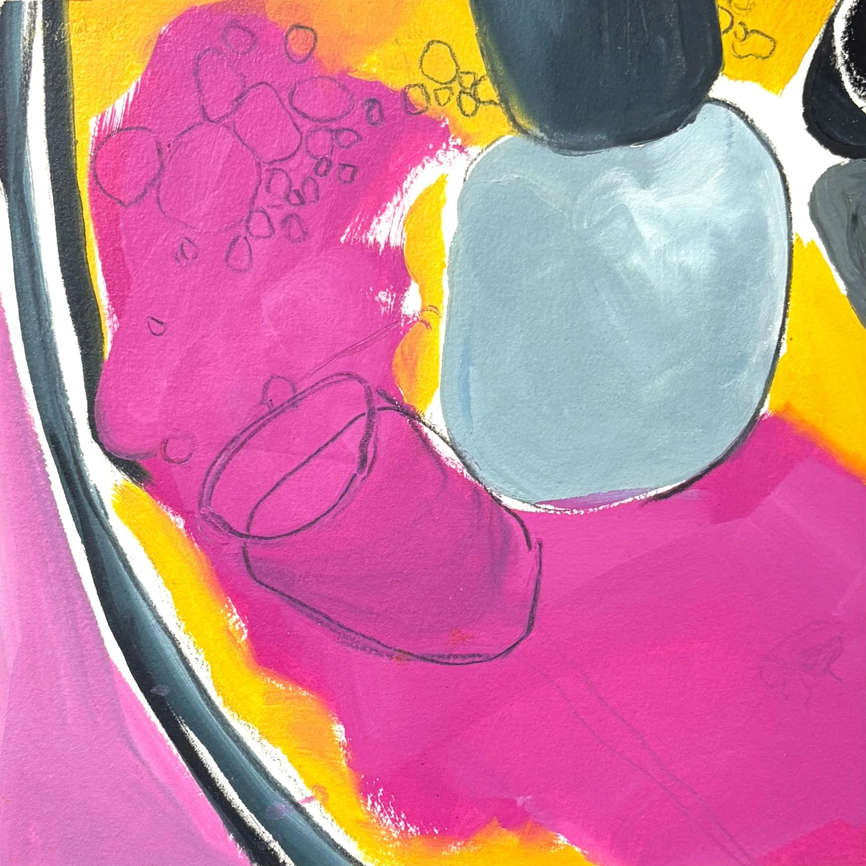 The artwork is an abstract composition featuring bold, irregular shapes in a vibrant color palette. Dominant colors include bright yellow, pink, blue, orange, red, and black, outlined with thick, black lines that define the contours and create dynamic contrasts. Areas of silver or gray add a metallic sheen to the piece, enhancing its visual texture. The composition is energetic and lively, with the shapes interlocking and overlapping, producing a sense of movement and spontaneity. The use of swirling lines and varied color blocks gives the artwork a playful yet structured feel.