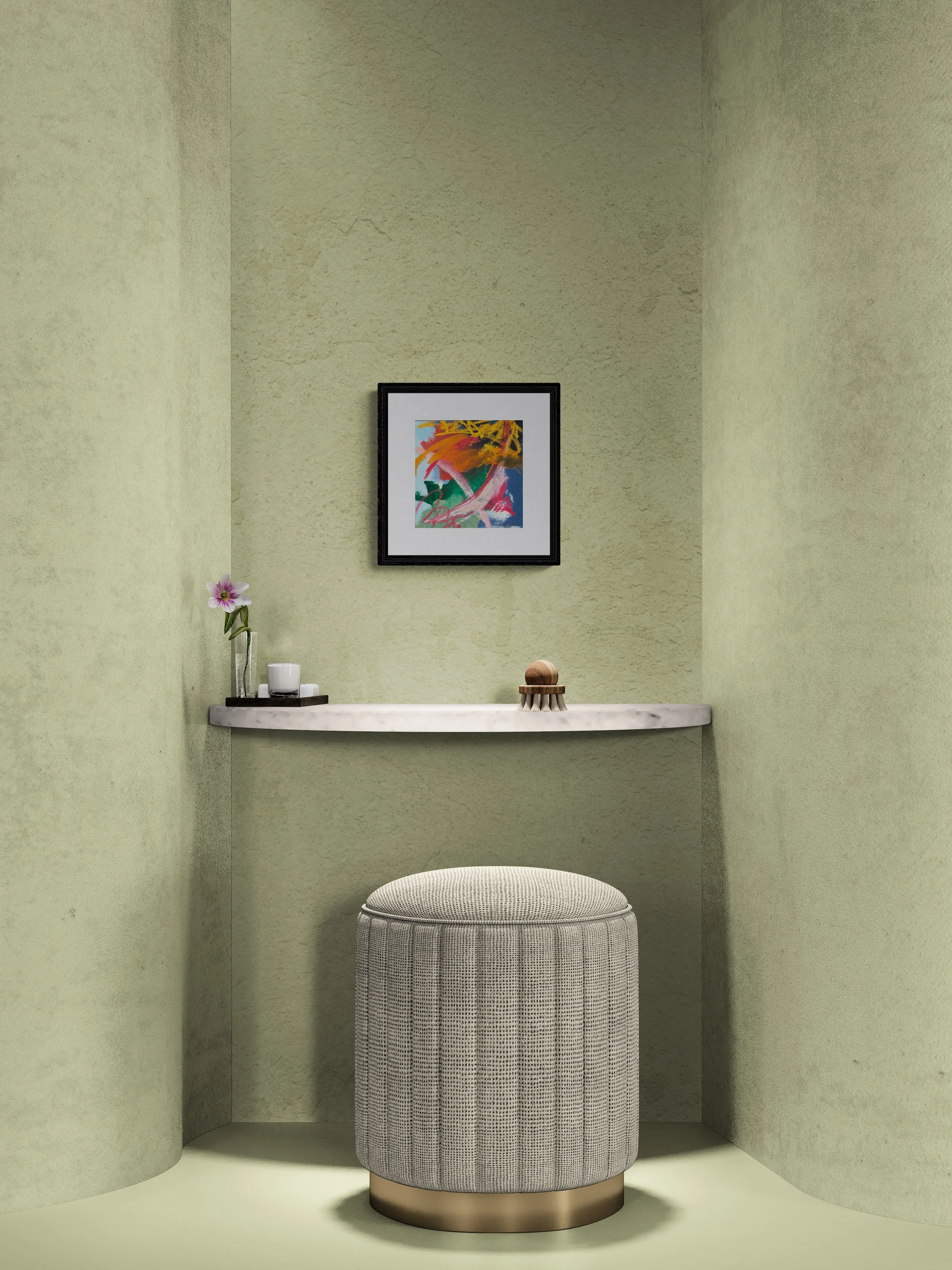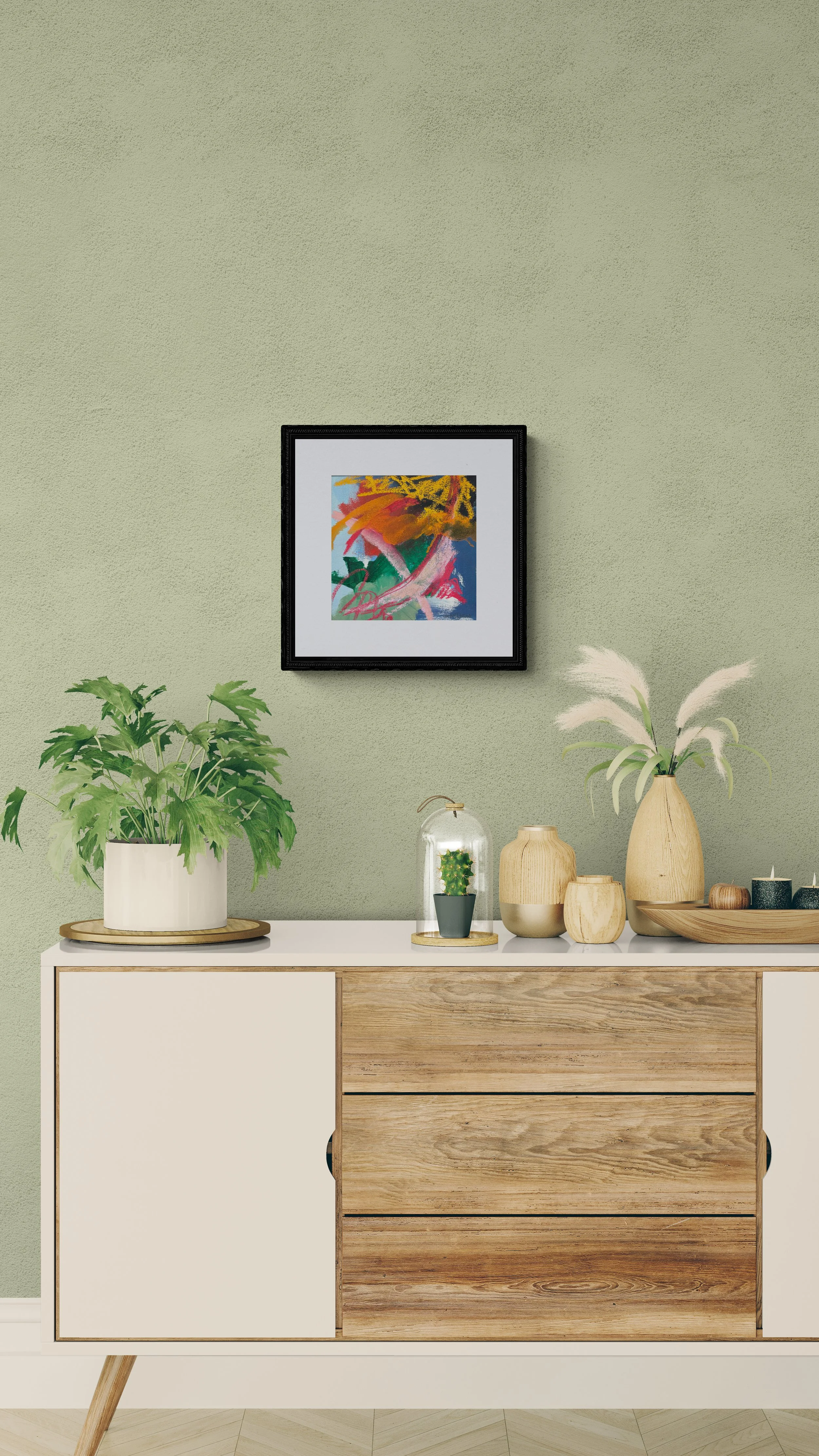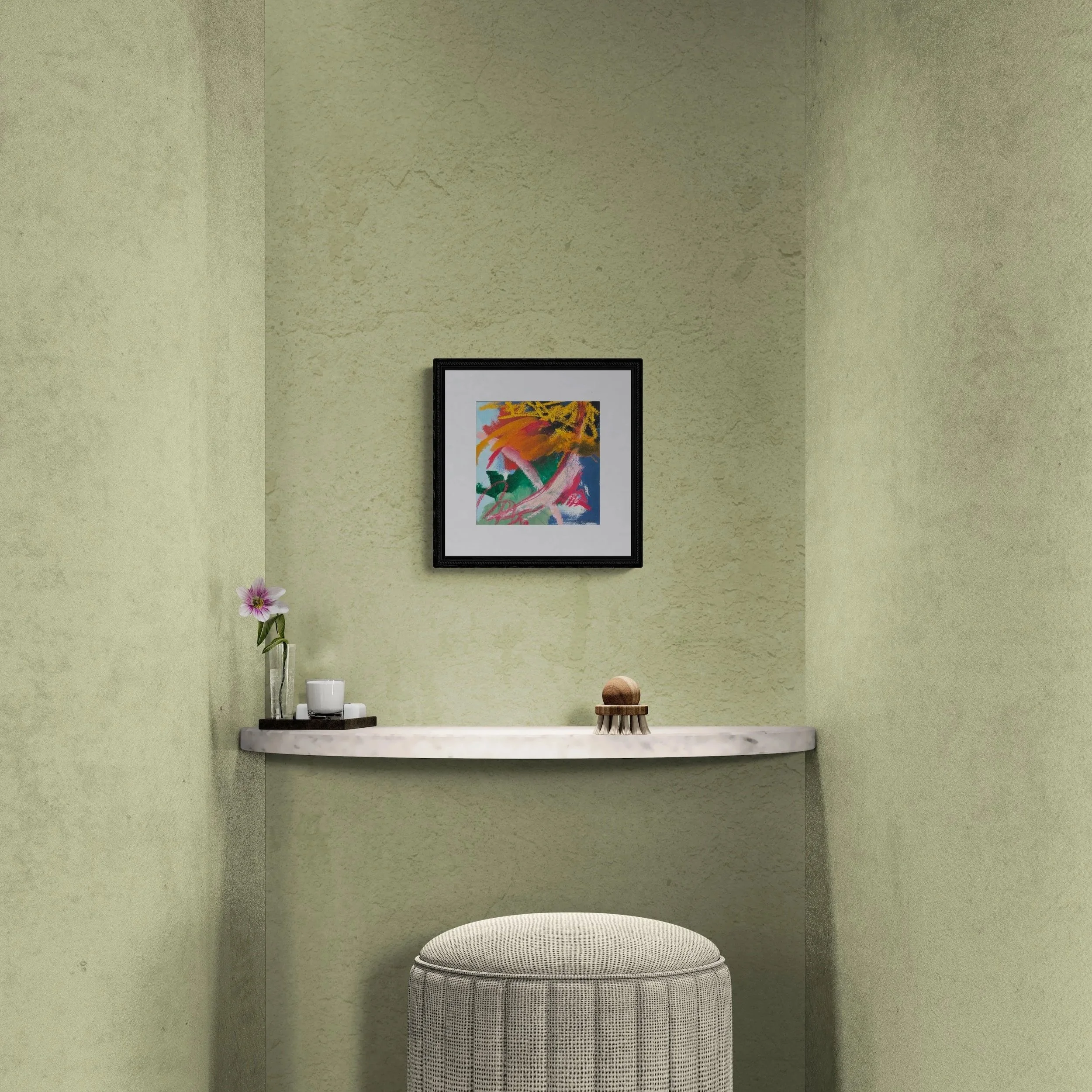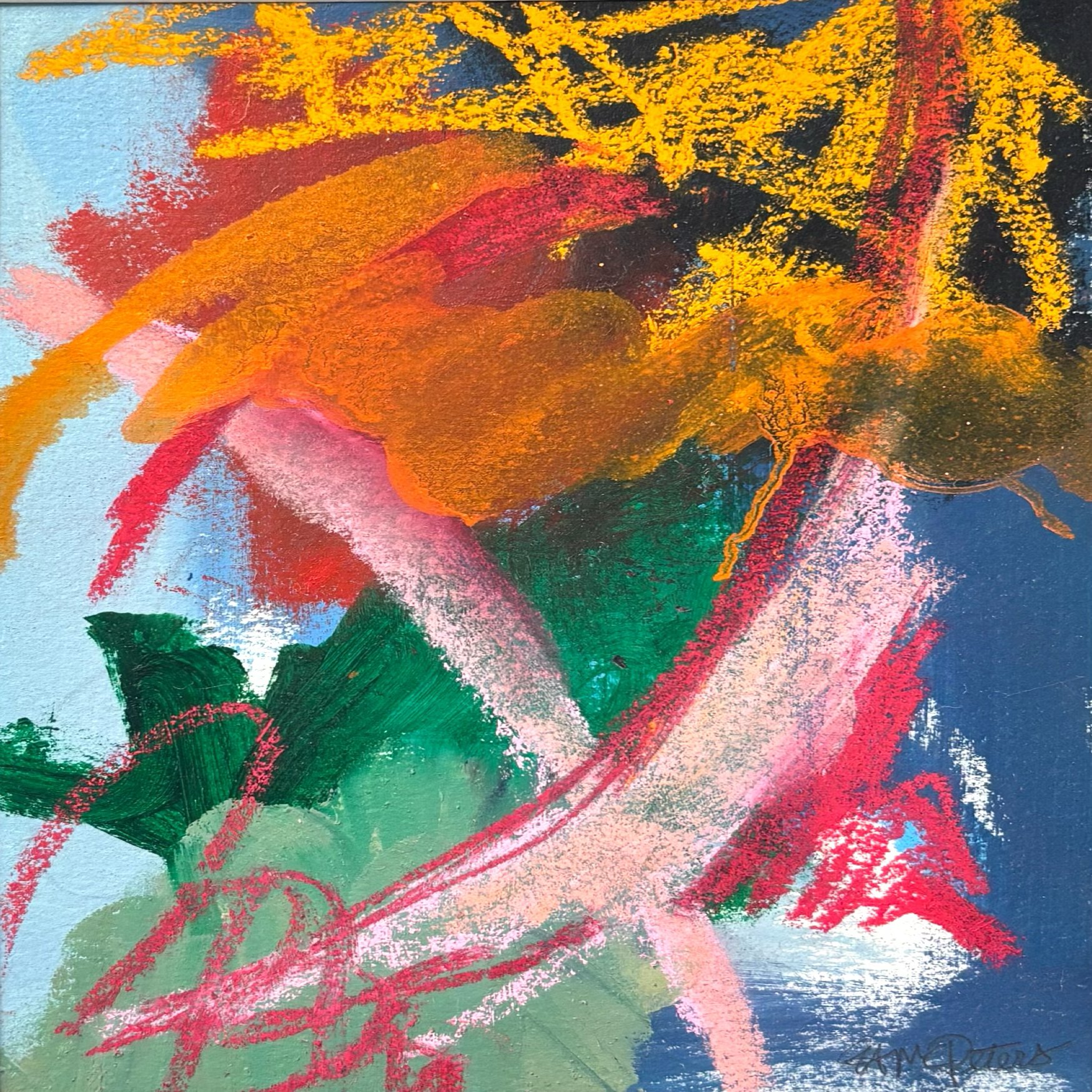 Work is approximately 9X9” with a 2.25” mat. Frame not included.