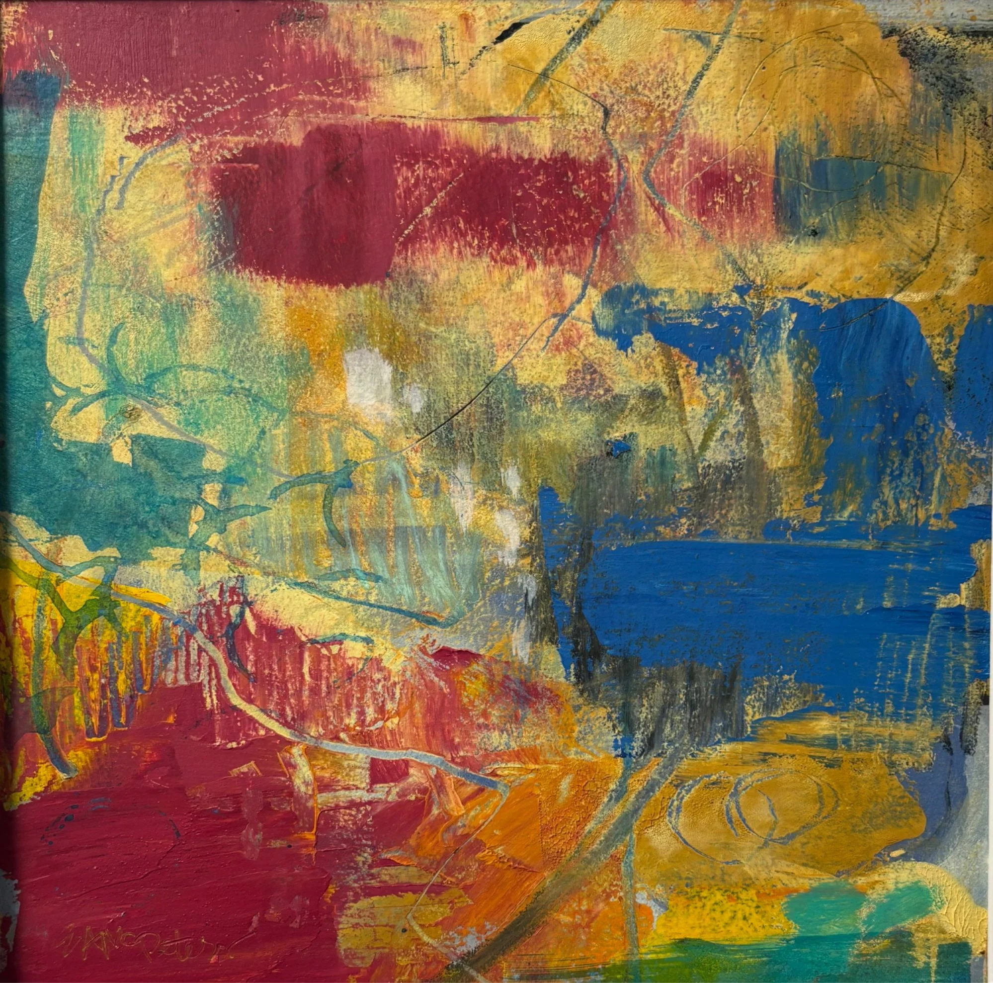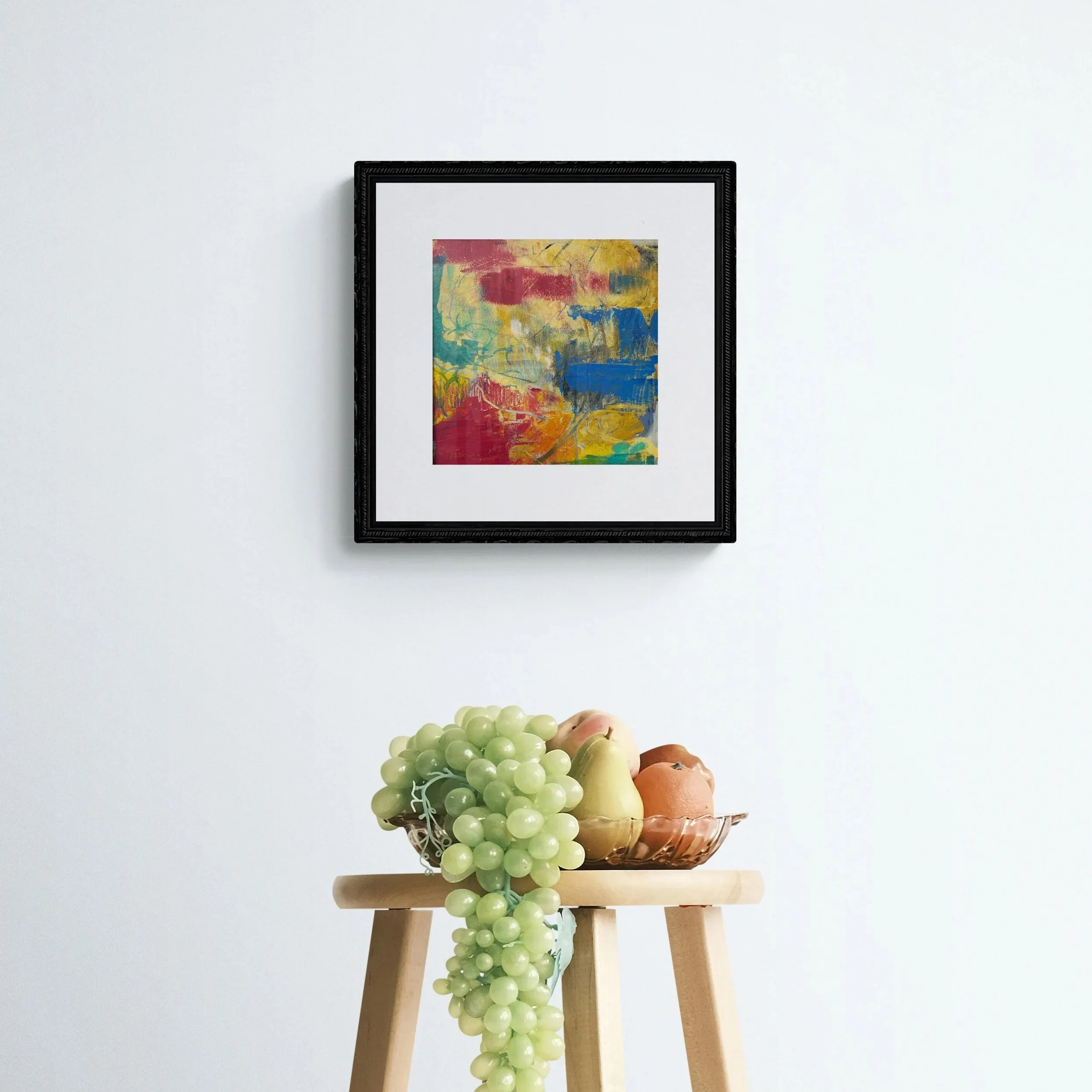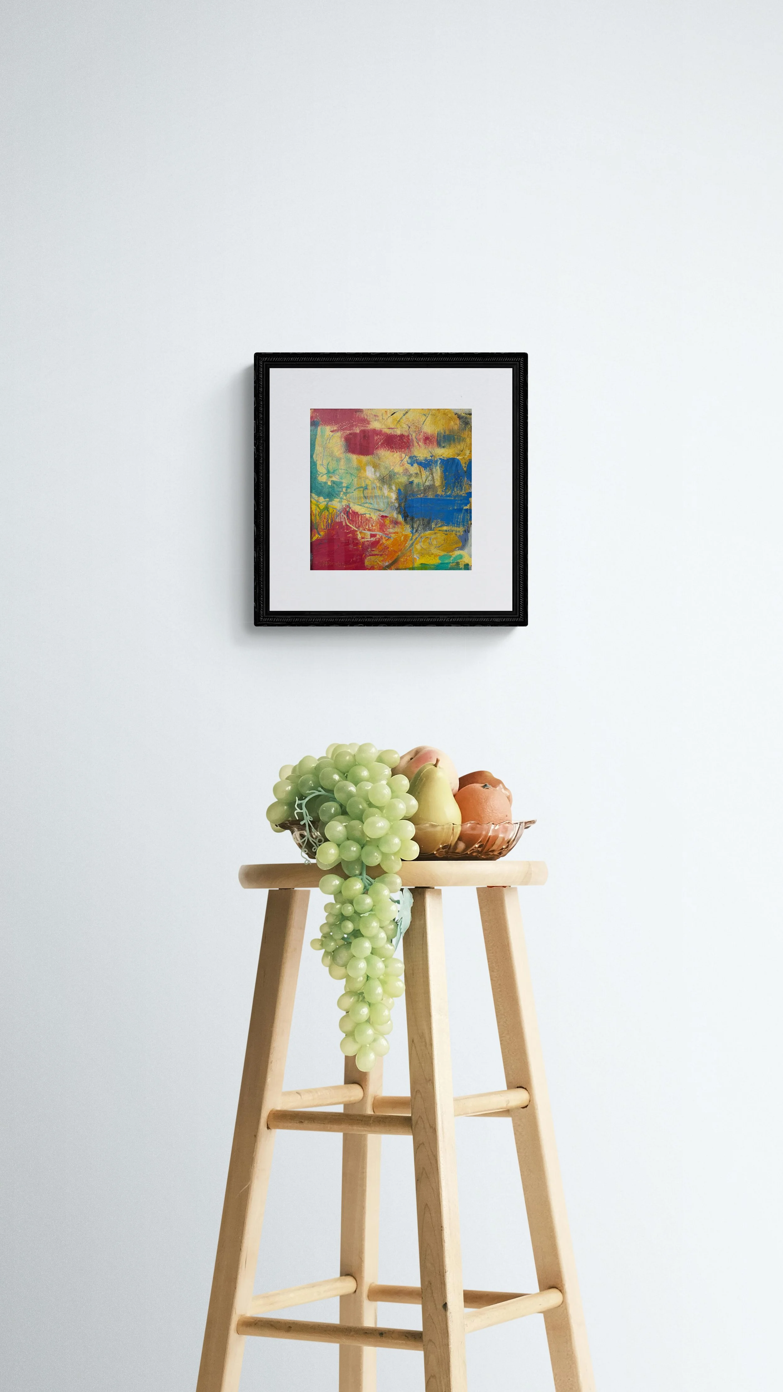 Work is approximately 9X9” with a 2.25” mat. Frame not included.