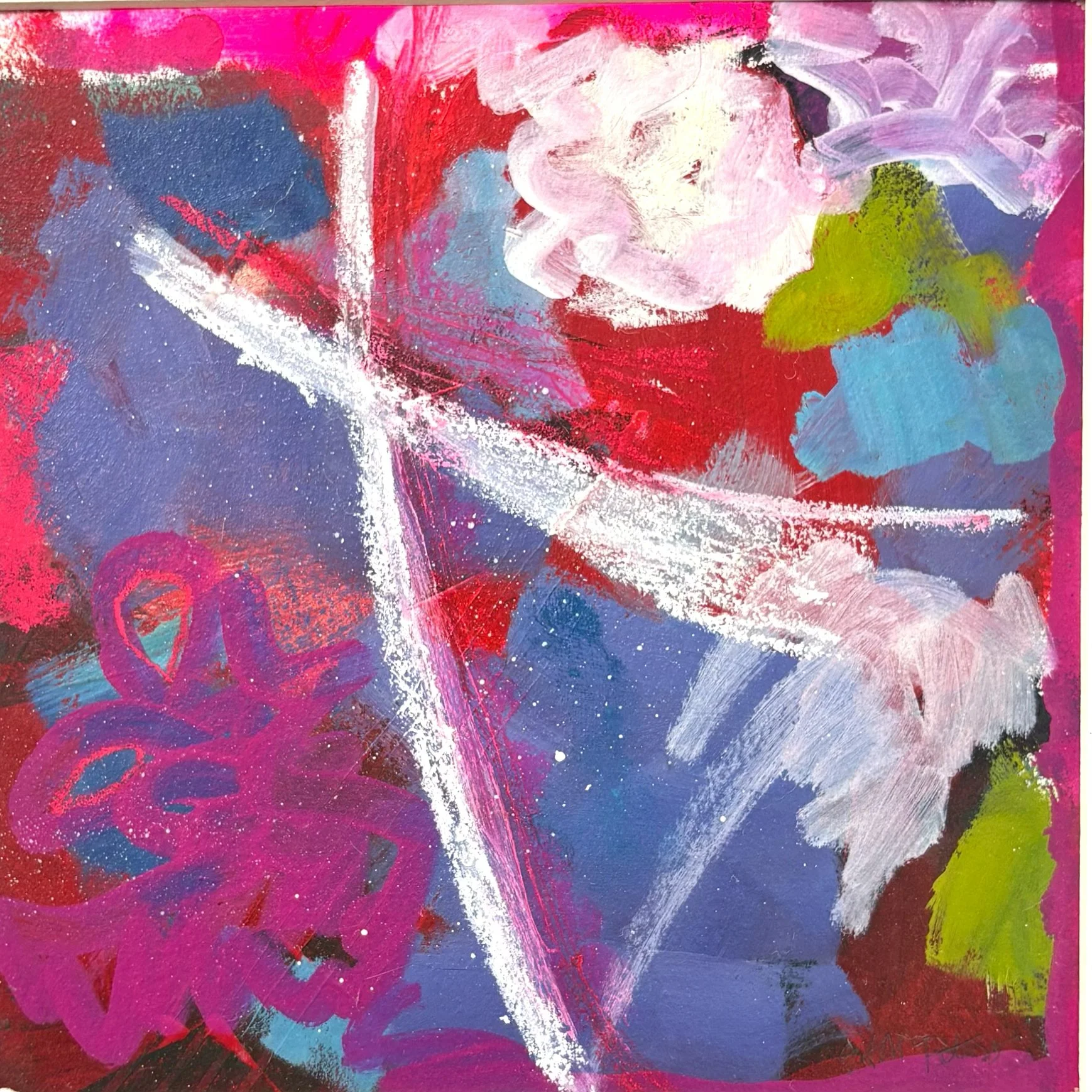 The artwork is an abstract composition created with vibrant chalk or pastel strokes on a dark surface. It features a variety of bold, sweeping lines and shapes in multiple colors including bright pink, red, blue, yellow, white, brown, and green. The arrangement of the elements forms an energetic and dynamic scene with overlapping contours and irregular patterns. The texture is rich and tactile, with layered and blended areas of color that give the piece depth and movement. The piece evokes a sense of spontaneity and expressive creativity, with no clear focal point, allowing the viewer's eye to roam fluidly across the entire canvas.